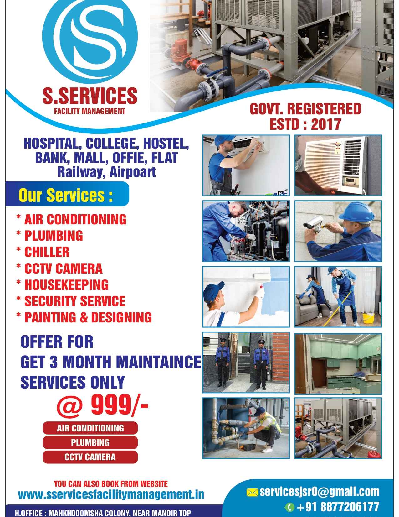 Established in 2017, our company S.Services Facility Management is a trusted facility management service provider in Jharkhand. With over 8 years of experience and an expert team, we provide our customers with excellent, timely, and affordable services. Our services cover a wide range of critical needs, including Chiller Services, CCTV camera installation, housekeeping, painting and designing, and security services.